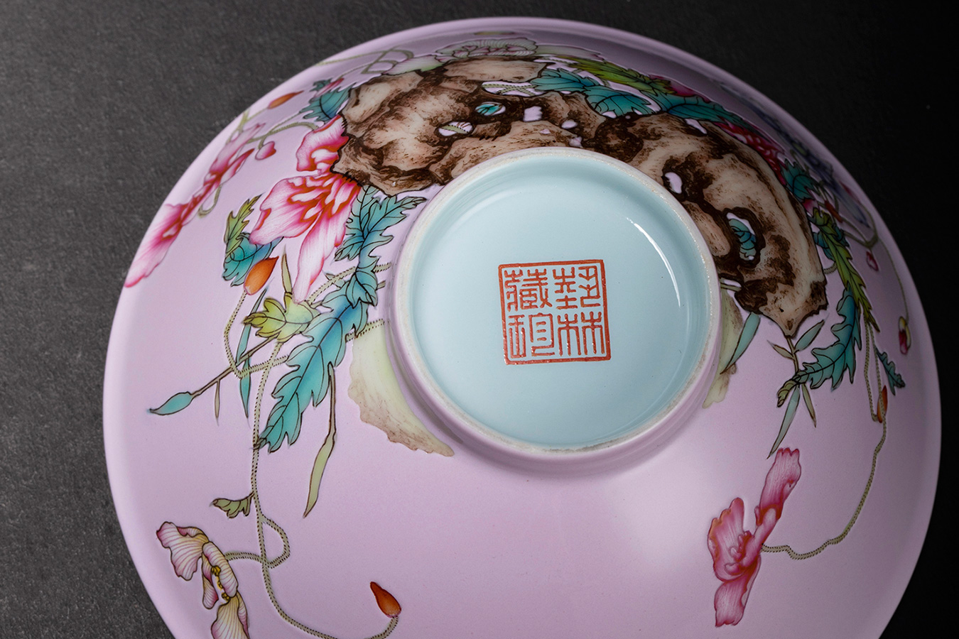 · 全器外壁施独配宫粉色地子。宫粉色是清代官窑中比较罕见的颜色,烧制难度非常高。 娇艳的粉色均匀肥厚,油润熠熠闪现光泽。与画面交接处,都处理得严丝合缝、既没有破坏画面整体,又没有漏笔的情况出现,足见画师深厚功力。花瓣黄自矜持、白怯羞绯、红恃娇纵、紫尚雅风,翠叶间,纤花或含蕾、或盛绽,曲茎摇曳微风中,石半掩、蝶萦绕,渲染描绘细腻如生。花瓣的细腻粉嫩的笔触质感来源于我们的选料,艺林堂遵循清代官窑制度,选用原矿粉彩老料。依旧采用了艺林堂最经典的“点染”手法,但这次在主次花瓣颜色的处理上,我们控制着“点染”手法,将不同光影与浓淡的变化做了区分,朵的色彩过渡自然表现出来,给人梦幻般的浪漫花卉效果。配景的叶片虚实相间,有用重色打底罩色或冷暖两色罩色两种手法表现。丰富的色彩变化将主题花卉更显突出表现,结合西洋光影透视技法和中国国画中不对称式构图使虞美人舒展的花朵在杯上似随风摇曳。杯心绘制三多瑞果纹样,更显清朗秀逸。