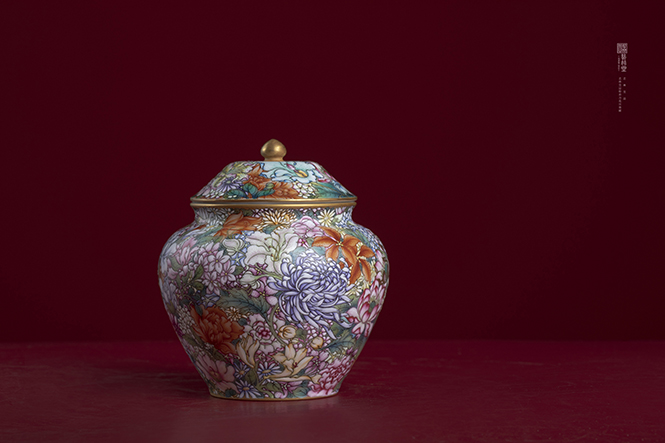 · 罐身外壁画面由大花小花相错杂,更显繁华似锦的富丽之态。烧制工序之繁缛,设色之丰富,绘画之多彩。非几人之力可成。没有一个经验丰富的师傅构图设计,既要体现尽收春意盎然之象而又无砌堆之感,是极难的。设计图临摹瓷上,必须与原稿一致。又要照顾到器表不同于纸面的不均衡特性,一旦有误,全局皆变,任其彩料何等妍美,画手如何高超,亦无法弥补画稿原有的神韵。 一器之上所见颜色不下于三十余种,故绘画之前,彩瓷的所有颜料必须配备,种类繁多几近百种,均需一一调试。此项工作之完成需动用多少人力,耗费多少时间,预支多少成本,可想而知。最后耗费几十个小时的洗染填色,方可烧制。
