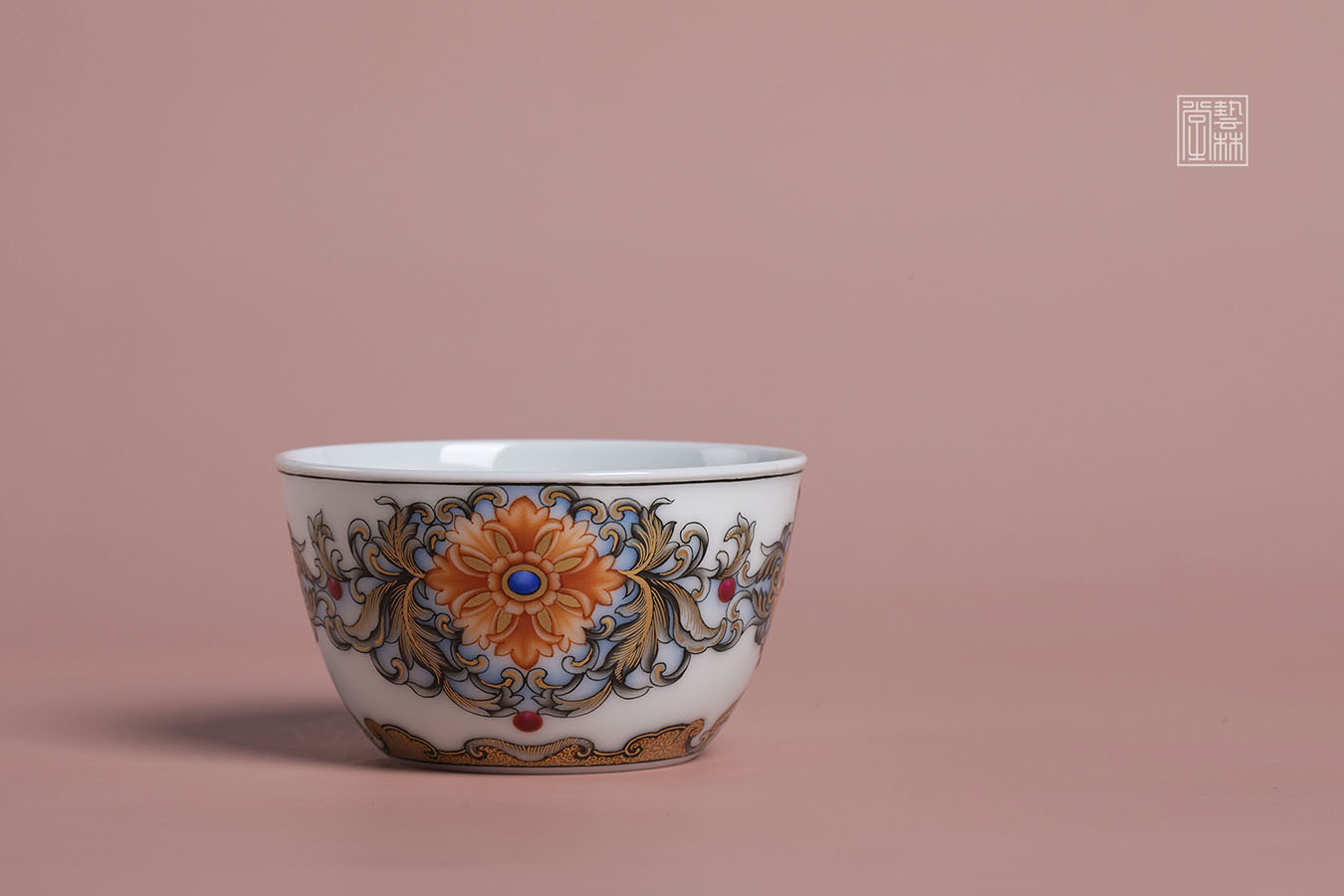 ·环绕杯腹一周我们以珐琅黑料和矾红双勾绘制主体的宝相花和卷草图案。叶片和花朵内部晕染皴擦出光影的视觉变化。叶脉叶筋及花瓣交接处再以本金描绘处细腻的纹路。叶底以宝石蓝料些许晕染处阴影。使得主体画面更加立体层次丰富。花心及叶尖分别以宝石蓝料和宝石红料绘制的宝珠纹装饰。 满工重彩,颜色粉润柔和、色彩丰富搭配协调养眼。在花瓣的刻画上,用到难度较大的“点染”填色手法。 枝叶缠连,描摹精益求精,叶脉丝缕可见, 宝相莲纹的布局,长短结合,花纹中疏密结合, 有一种不失严肃的活泼趣味。