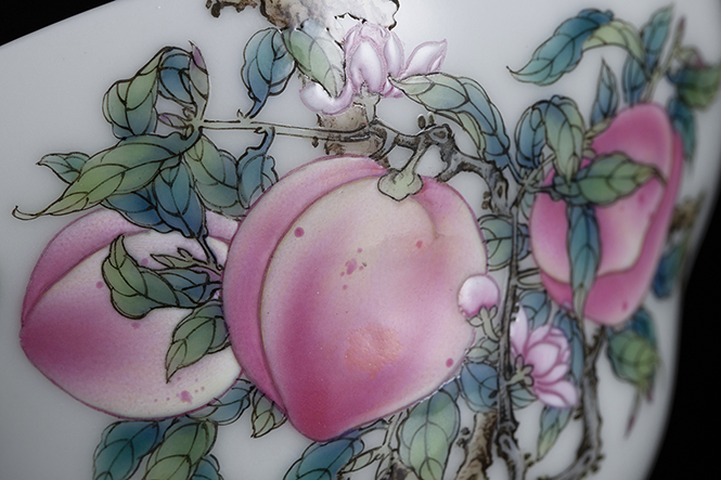 ·满桃的设计诠释了艺林堂对于传统桃子题材的再一次革新,区别传统的九桃五福的固定制式。我们在杯身外壁满工满绘出堆叠的桃子将重工粉彩和瓷器这两种顶级手工艺集合,并将各种视角的桃子填满整个画面,不露出瓷底,更显繁华似锦的富丽之态,在富丽繁华中尽显雅致内敛。以艺林堂熟练工艺提炼的矾红,色彩饱满色阶丰富。层次可达7层以上,在不同层次最深处泛出金属光泽,层层过渡下来最淡处不仅色彩依旧饱满且富有黄金光泽。刚刚烧制出来的新矾红,不仅给人感觉亮丽,犹如一层翡翠折光,并且内敛润泽!同时在使用的过程中会越来越亮,并且会越来越柔润!万桃看似很满,其实构图的章法更加讲究,平铺则无趣,过散则无主题,所以一副有层次有虚实有主次的设计就考验制作者的水平了!在卷轴通景的杯身上不规则的布开4处全桃,也就是可见到全面的桃子,作为视觉的焦点,也是最表层!但每处聚散不一,三三两两,分布开来!从上至下最多九层,桃子的显露不规则,桃尖,桃腹,桃尾,层叠散开,自然随性!中以桃花桃叶,蝙蝠点缀,生动别致,活泼自然!中锋用笔去勾勒外线。这是过去顶级官窑的要求,因为不露锋的线条,是过去顶级官窑的内敛高级,甚至是变态的要求。钉头鼠尾的线条是国画中的常态表现,而没有丰富经验且稳定的手握,很难流畅!对于画师的功底很讲究,要求特别高。除去技法上的严格要求,在颜色的彩染上同样严苛,既要将颜色晕染有层次,还得不见笔触,细腻柔润!这个是对细心和原料的高级有要求,九层的画面层次就必须对光感的把握非常强烈,所以在用料和光感的区分上就得有对比,有深浅!用复杂满工来表现雅致和简约!并且整幅图能感受到聚散和自然,所以主次,虚实,层次,都要有节奏的体现!让人观赏完有一种繁而不乱,甚至是听一场音乐会的感觉,有高潮有低谷,有舒展,有缓急的态势!