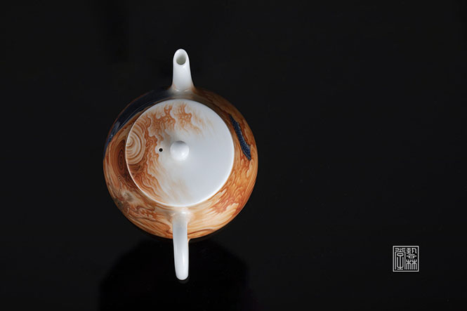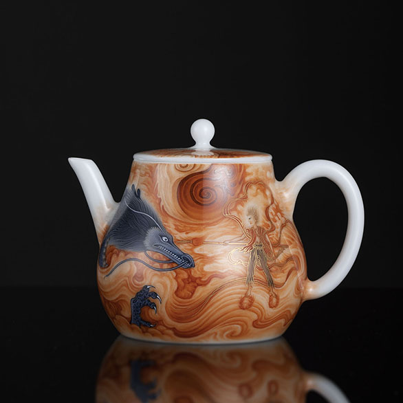 ·《淮南子·地形训》中写道:“毛犊生应龙,应龙生建马,建马生麒麟,麒麟生庶兽,凡毛者,生于庶兽”, 麒麟是应龙血脉的主要分支之一。 不同版本的古籍中,都描述它首似龙,形如马,状比鹿,尾若牛尾,背上有五彩毛纹,腹部有黄色毛。我们依据查阅的古籍对于麒麟的形象描述结合我们理解和现代的审美考虑将文人的笔墨之韵与陶瓷工艺相结合,用笔刚劲果决,在麒麟的明暗刻画上更富有体量感。采用清代宫廷的“珐琅黑料”,其发色细腻稳重,烧成后有堆积感形成油润的质感效果。层次丰富的皴擦效果也是其最大的料性特点,用笔墨的质感表现的光影更显肌肉感,折射出麒麟的魁梧与霸道。为了更好的视觉呈现效果我们一改传统墨彩的单调形式。用玻璃白点缀丰富麒麟头部和四肢的细节部位起到了“点睛”般的神奇表现力。背景以黑料皴擦出层次丰富动感强烈的云纹, 质感柔软。麒麟隐现与云雾之中又吸收了西洋写实光影技法,加之细腻的工笔技巧些许本金绘制的云雾更显主体的灵动神秘。麒麟的隐匿与显现恰到好处,隐的多了画面就失衡了,显的多了画面就很拥挤,由于画眼在盘中心,通过麒麟头部和部分躯干、四肢在云雾中的显现起到画面稳定的作用。