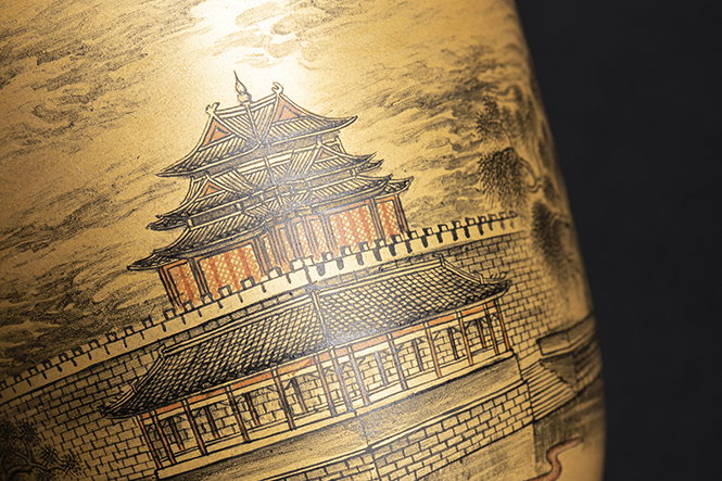 · 我们以漆器的红、黑、金、银为主色彩基调,气质内敛而稳重,一眼便给人不同凡响的高级视觉感受,同时让人感受着“跨界”的工艺带来的无尽乐趣。在构图布局上,从上至下我们用错金银绘制多组青铜器上的经典纹饰,乳钉纹、螭龙蝠纹、火珠纹、菱形纹等,画面紧凑,满而不散,密中求疏,交映成趣。我们仿漆工艺的研发,也是延伸创新仿生瓷的不断探索。在肥厚的黑地上施金银难度极高,若要成色均匀则更难上加难,这或许是金银在瓷器品种中不常见的原因。首先,原料必须纯净,只能借助纯手工研磨成极微细粉末,才可均匀分布表面。不但原料成本昂贵,更须耗费长时间的人力调配。最后烧制火候亦极其讲究,温度太低,出窑后金银料一抹即落,温度过高,则易生小粒,亦有损轮廓之清晰。瓷仿漆的难点不仅是绘画上,关键点是不能带有陶瓷的影子。拿到一件仿漆的瓷器不能看到瓷胎与釉面(本体)才算是“跨界”成功。我们同样也将这点拿捏到位,外表以黑漆错金银表现富丽奢华,在里部和底部则用红地与包金银工艺将瓷器的本体包裹的丝毫不漏。一件质地坚硬的瓷器就这样被成功伪装成了体态轻盈的漆器。