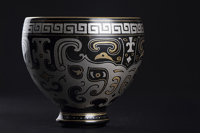 ·我们以漆器的红、黑、金、银为主色彩基调,气质内敛而稳重,一眼便给人不同凡响的高级视觉感受,同时让人感受着“跨界”的工艺带来的无尽乐趣。我们是现代陶瓷中,最早将“仿漆”工艺做到成熟的,其中付出的努力更是不言而喻。在仿漆器色彩的配制上,我们采用传统粉彩颜料调和而成。色泽不仅亮丽饱满,而且内敛润泽。在构图布局上,从上至下我们用错金银绘制多组青铜器上的经典纹饰,画面紧凑,满而不散,密中求疏,交映成趣。我们仿漆工艺的研发,也是延伸创新仿生瓷的不断探索。在肥厚的黑地上施金银难度极高,若要成色均匀则更难上加难,这或许是金银在瓷器品种中不常见的原因。首先,原料必须纯净,只能借助纯手工研磨成极微细粉末,才可均匀分布表面。不但原料成本昂贵,更须耗费长时间的人力调配。最后烧制火候亦极其讲究,温度太低,出窑后金银料一抹即落,温度过高,则易生小粒,亦有损轮廓之清晰。瓷仿漆的难点不仅是绘画上,关键点是不能带有陶瓷的影子。拿到一件仿漆的瓷器不能看到瓷胎与釉面(本体)才算是“跨界”成功。我们同样也将这点拿捏到位,外表以黑漆错金银表现富丽奢华,在里部和底部则用红地与包金银工艺将瓷器的本体包裹的丝毫不漏。一件质地坚硬的瓷器就这样被成功伪装成了体态轻盈的漆器。