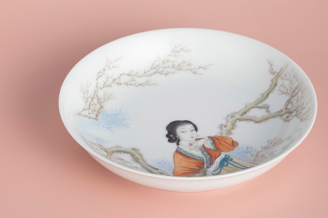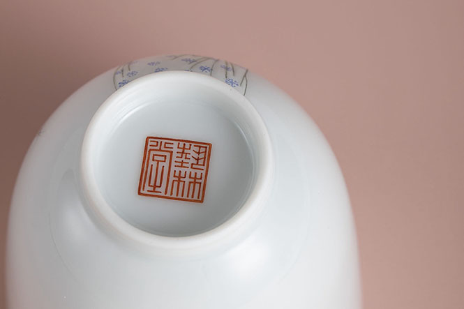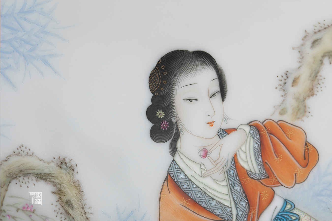 ·兰花这种绘画题材,看起来比较简单,但画起来却不容易,如要画得好,需要有坚实的笔墨功夫和深厚的技巧为根基。我们画师创作这款《新雨幽兰》时,注意揣摩表现对象的形态和特点,充分运用笔墨通过不同层次的渲染,使得画面成为来自现实,又高于现实的成功作品,令人百看不厌。湖石有阴阳向背,上白下黑,上疏下密,疏白为阳,黑密为阴。用笔挥洒自如,发挥线条的张力和审美趣味,顿挫转折,增加石头坚硬的立体感。兰花花瓣采用“套色”手法,先以浅浅的淡绿打底,再用宝石红在花瓣上结果勾勒出花丝,中锋用笔将清秀的兰花显现出一丝妩媚的灵气。兰叶往往一笔挥就辗转有序,施墨上浓下淡,线条苍劲有力,富有生动的表现力。蝴蝶翅膀上的绒毛短线入锋出锋均细,将蝴蝶飞舞的灵动轻盈刻画的活灵活现。巧妙地结合器型,将飞舞的蝴蝶作为远景绘于碗盖之上,碗身绘制兰叶、兰花、湖石、蝴蝶,层次分明为中景也是主景。碗托在使用过程中,可视范围只能触及近景的兰叶湖石,很好的拉开空间感。