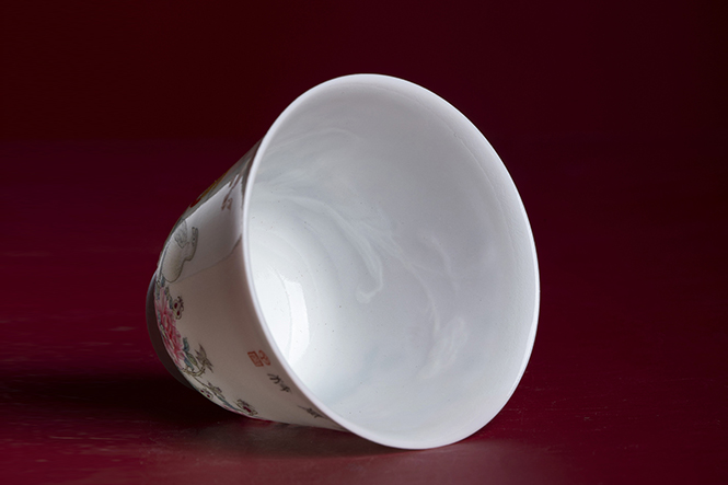 ·在构图上,我们在壶外壁口足处以二方连续式环绕器物一圈绘制多组纹饰,从上至下分别是如意头形花瓣纹、弦纹、点珠纹、回纹。简单来看是一些普通点、线、面的集合体,然而我们在其表现上更具有条理、反复有节奏,它们有的严整规范,有的自由活泼,有的灵动娇巧,给人以不同的遐想,具有与自然界线条不一样的形式美感。为了体现元素其本体,我们没有“炫技般”使用多重工艺,仅是这纯粹的堆描金,通过一遍遍的叠加更凸显其精致与设计美感。我们利用“留白”的巧思,让边饰更显醒目清晰,多组流线型的图样装饰也将留白处如玉般的胎釉质感衬托得高级感满满。胎骨细柔坚致,带有晶莹的光泽。釉水洁净匀厚与胎骨结合紧密浑然一体,呈色温润剔透素实雅观。